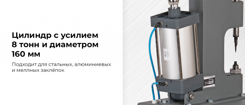 используется для установки и удаления заклепок на легковых и грузовых автомобилях, при замене накладок тормозных колодок и дисков сцепления. Цилиндр 160 мм позволяет работать с заклепками диаметром до 12 мм.