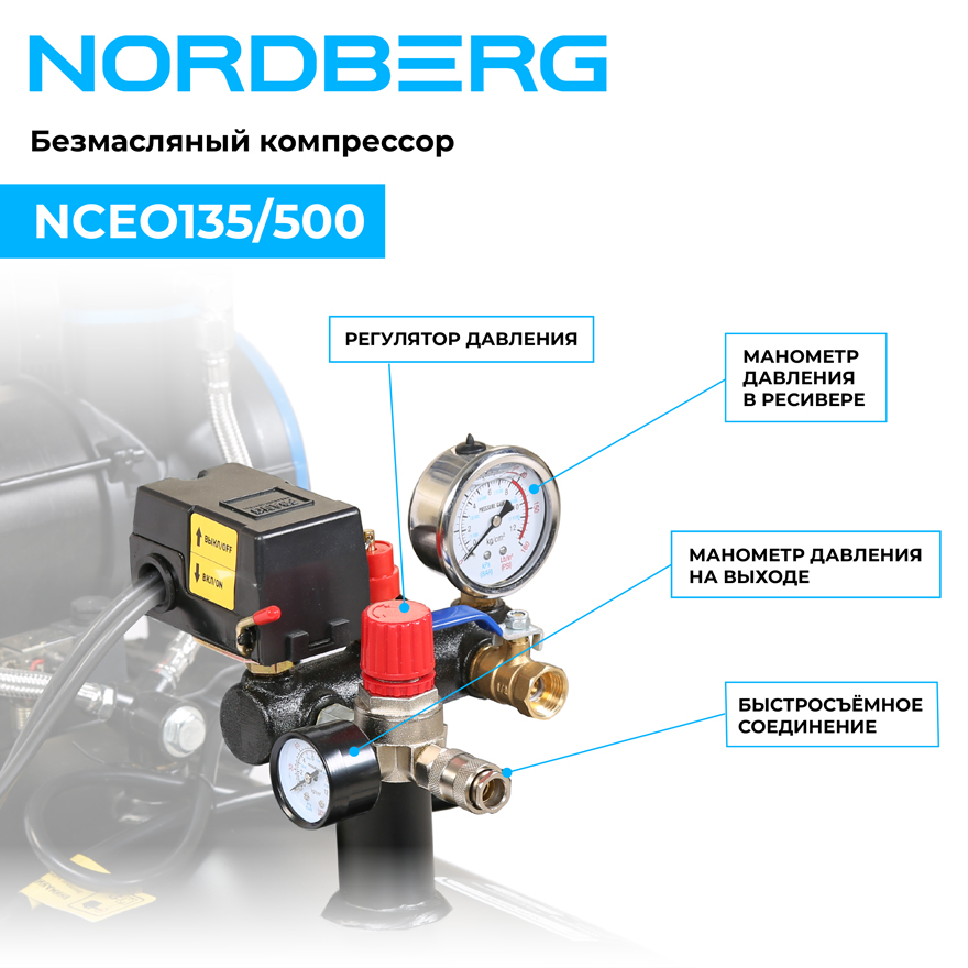 Безмасляный компрессор NORDBERG NCEO135/500 долговечен, не требует высоких затрат при его эксплуатации и не загрязняет окружающую среду.