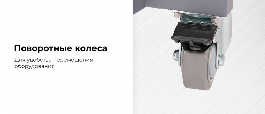 • Манёвренность: установка оснащена колёсами для перемещения, два из которых поворотные со стопорами.