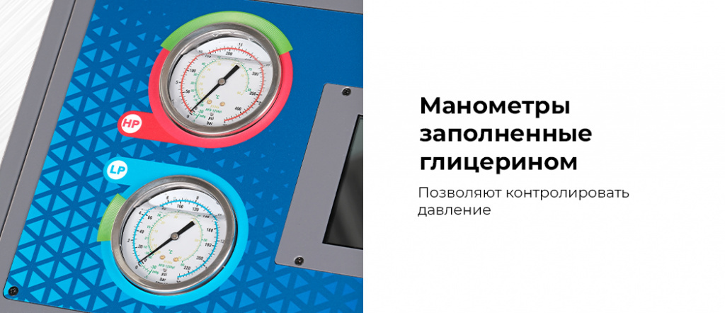 • Большие манометры, заполненные глицерином: точные показания и удобство контроля давления;